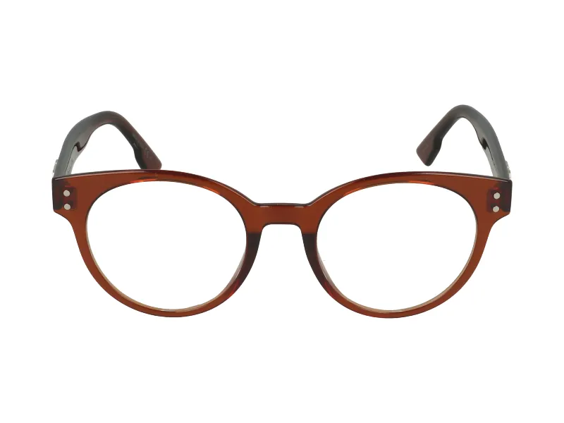 משקפי ראייה בעלי מסגרת עגולה חומה שקופה.