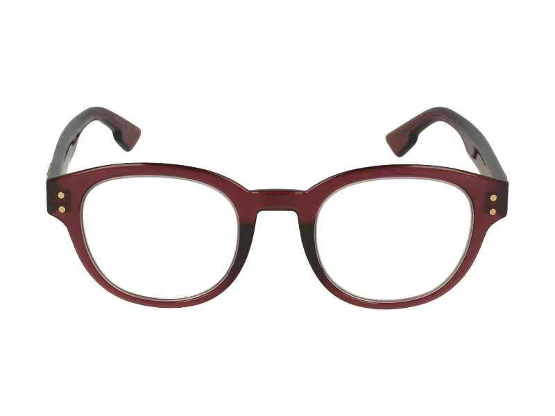 משקפי ראייה בעלי מסגרת עגולה בצבע בורדו שקוף.
