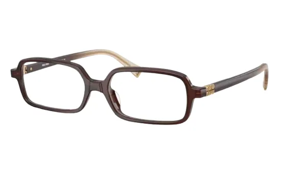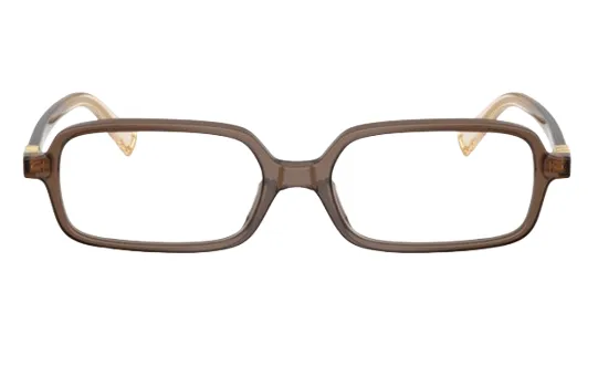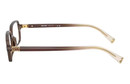 משקפי ראייה מבית מיו מיו בעלי מסגרת מלבנית חומה שקופה, סמל המותג בצידי המוטות בזהב.