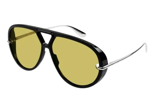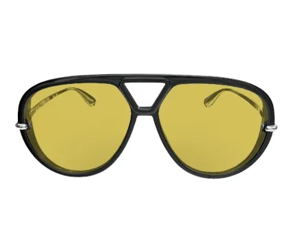 משקפי שמש מבית בוטגה ונטה בעלי מסגרת אוברסייז שחורה עם עדשות צהובות ומוטות כסופים.