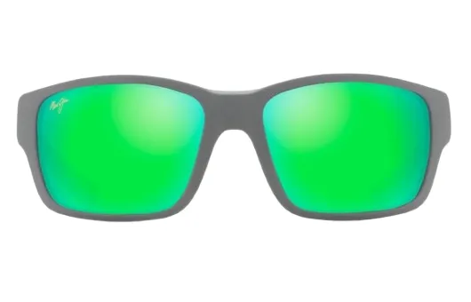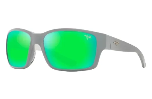 משקפי שמש מבית מאווי ג'ים בעלי מסגרת מלבנית אפורה ועדשות פולארויד מראה ירוקות.