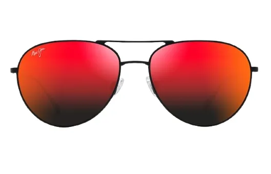 משקפי שמש מבית מאווי ג'ים בעלי מסגרת שחורה בסגנון טייסים עם גשר כפול בגימור מאט ועדשות פולארויד מראה אדומות מדורגות.