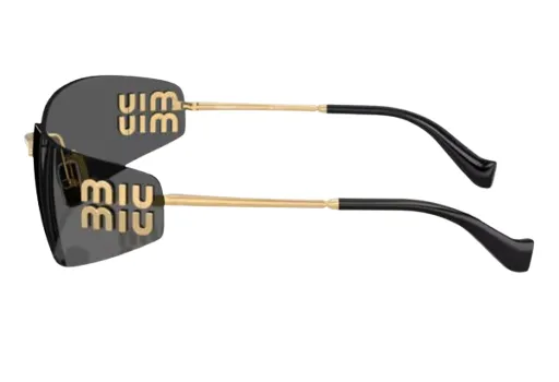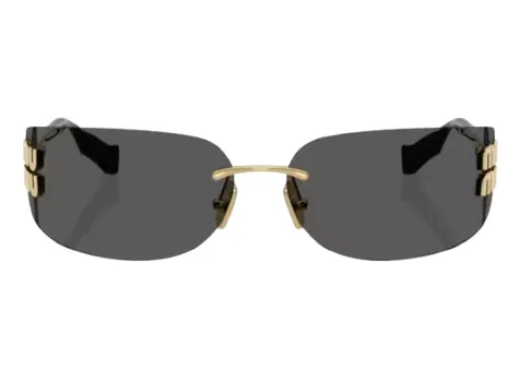 משקפי שמש מבית מיו מיו ללא מסגרת, מוטות בצבע זהב ועדשות אפורות בהירות.