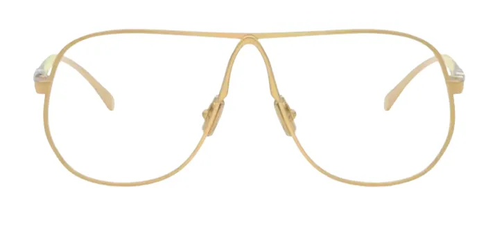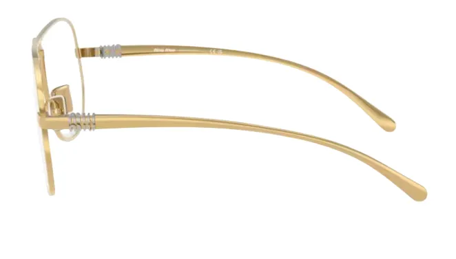 משקפי שמש מבית מיו מיו בעלי מסגרת טייסים זהובה ועדשות שקופות אור כחול.