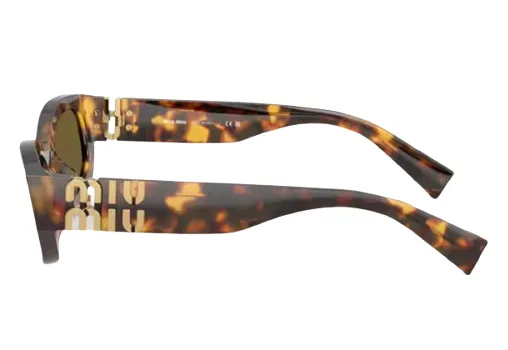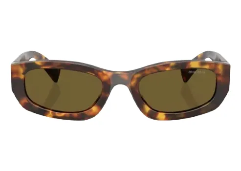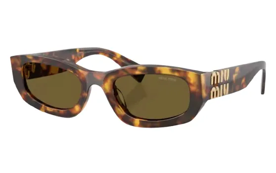 משקפי שמש מבית מיו מיו בעלי מסגרת חתולית מנומרת, סמל המותג בצידי המוטות בזהב ועדשות חומות כהות.