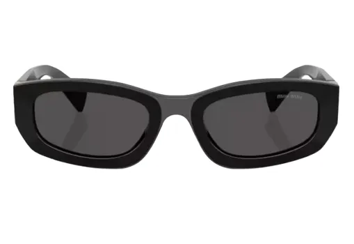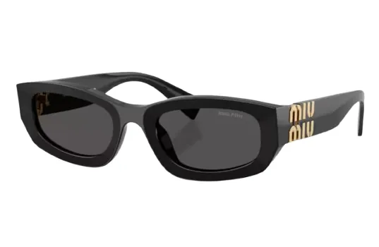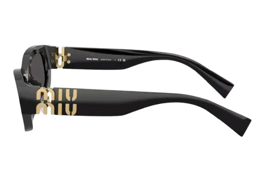 משקפי שמש מבית מיו מיו בעלי מסגרת חתולית שחורה, סמל המותג בצידי המוטות בזהב ועדשות אפורות כהות.