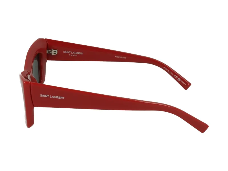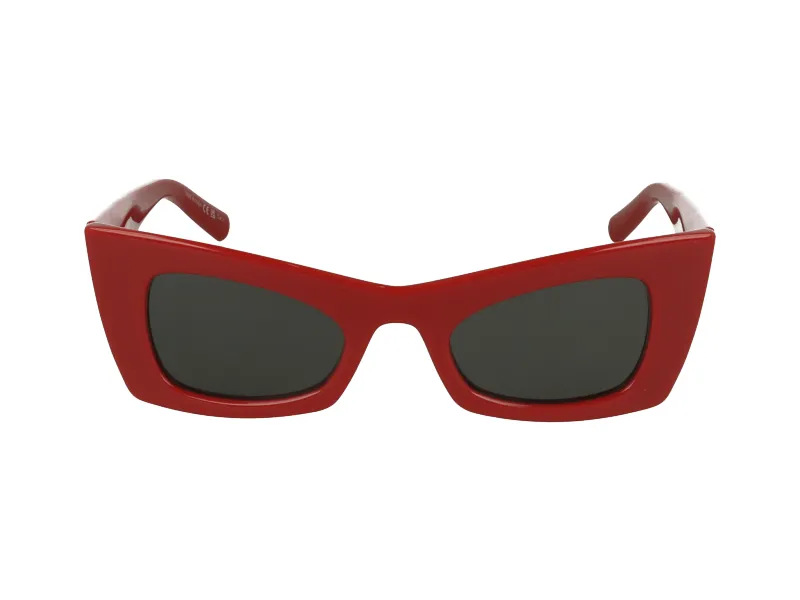 משקפי שמש מבית סאן לורן בעלי מסגרת חתולית בצבע אדום בורדו ועדשות אפורות כהות.