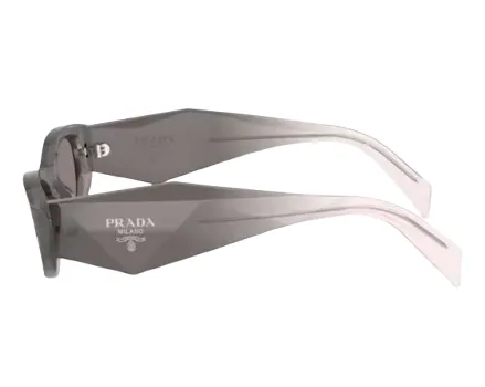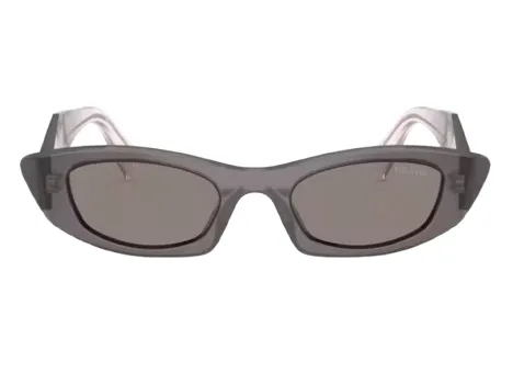 משקפי שמש מבית פראדה בעלי מסגרת אובלית אפורה שקופה ועדשות אפורות כהות.