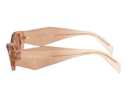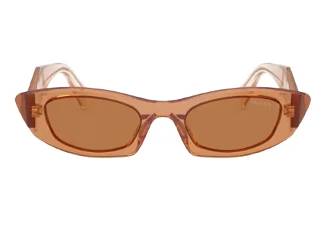משקפי שמש מבית פראדה בעלי מסגרת אובלית חומה שקופה ועדשות חומות.